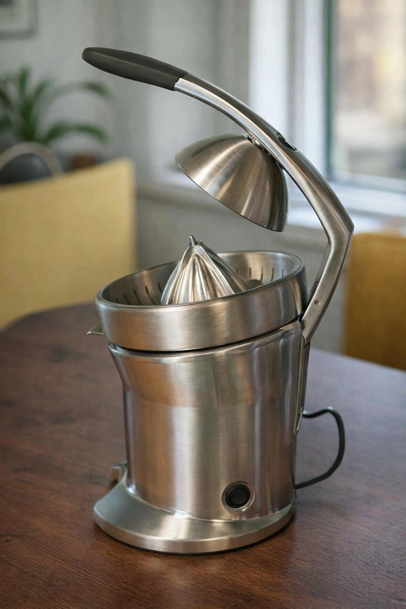 It looks great on the counter and feels solid thanks to its metal construction. Cleanup is very easy — just rinse the three parts or put them in the dishwasher. There are a couple of things to keep in mind. The handle doesn’t lock down, which makes the unit about 18 inches tall, and it does cost more than most citrus juicers. Even so, if you juice citrus regularly, the build quality, performance, and convenience make the price easy to justify.