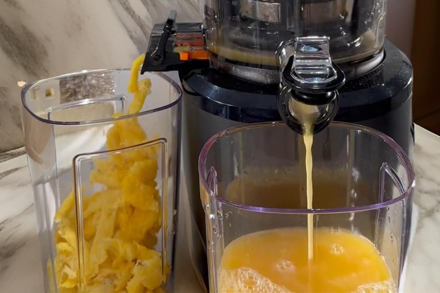 We tested the Auto10 extensively. We ran carrots, beets, celery, leafy greens, and oranges through it, and the yield was excellent across the board, which is what we expect from a premium slow juicer. The pulp comes out very dry, showing how efficiently it extracts juice.