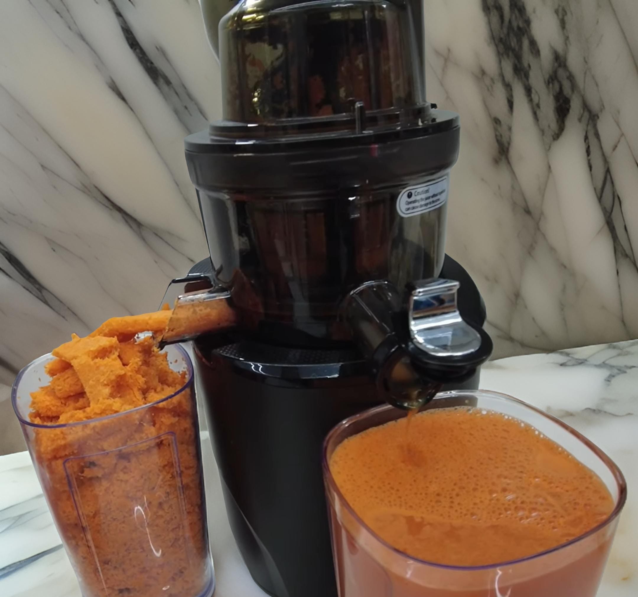 Watermelon juice came out with a good yield. Pomegranate pulp was impressively dry. And whole oranges dropped into the 3.5″ chute produced a bright, high-yield juice with almost no effort.